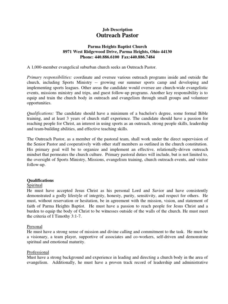 JID44 Parma Hts OH Outreach Pastor Job Description PDF Missionary